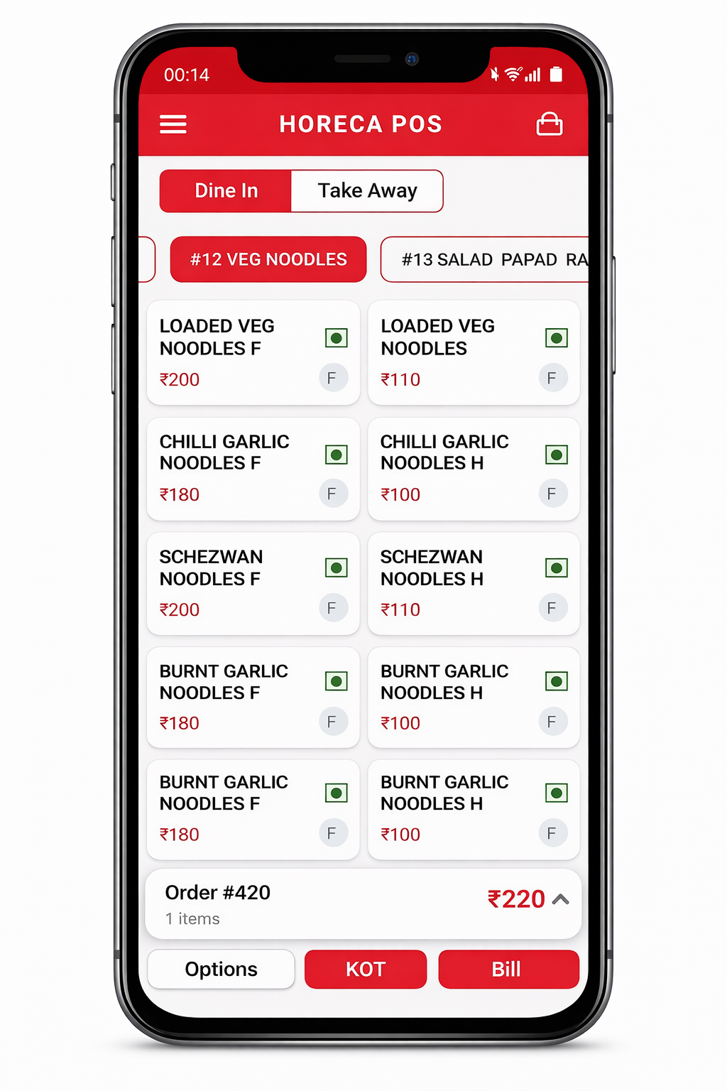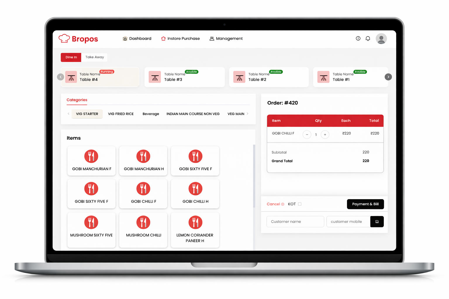 Clean screens for billing, kitchen flow, and menu management.